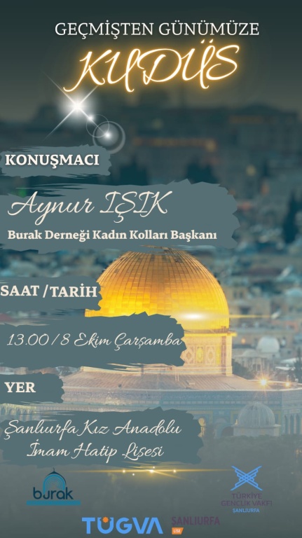 Okulumuz konferans salonunda 08/10/2025 Çarşamba saat 13.00 de Burak Derneği Kadın Kolları Başkanı Aynur IŞIK Geçmişten Günümüze KUDÜS konulu konuşmalarını yapcaklardır. TümÖğrenci ve velilerimiz katılım gösterebilirler.